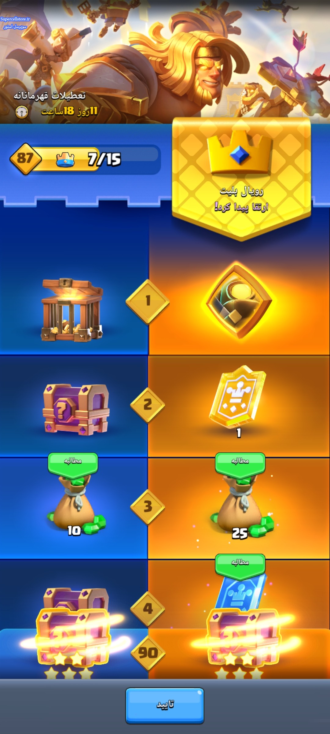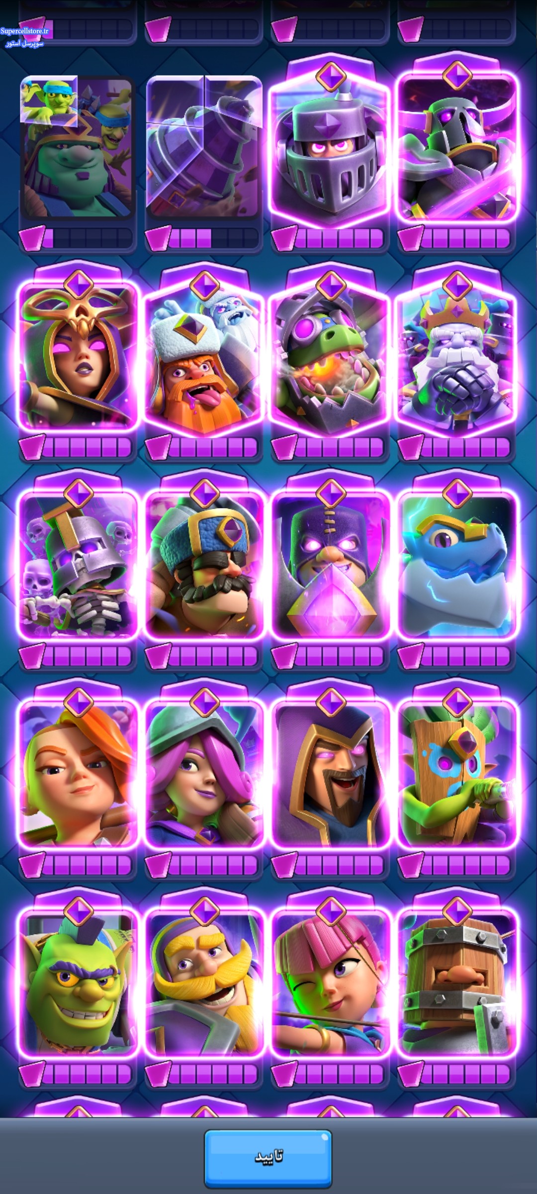 اکانت قوی کلش رویال شامل پس رویال فعال و کلی ایموت پولی خریداری شده و اسکین تاور و دو هیروی نایت و مینی پکا و ۲۹ اوولیشن