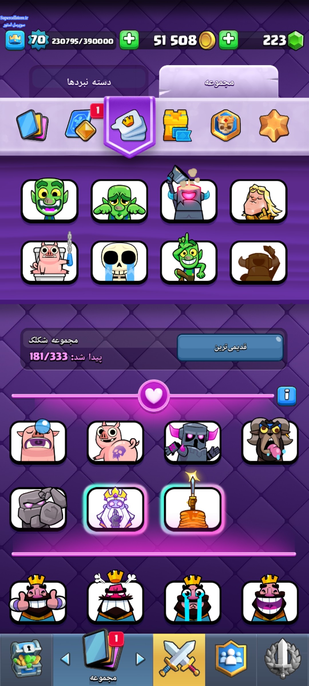 اکانت قوی کلش رویال شامل پس رویال فعال و کلی ایموت پولی خریداری شده و اسکین تاور و دو هیروی نایت و مینی پکا و ۲۹ اوولیشن